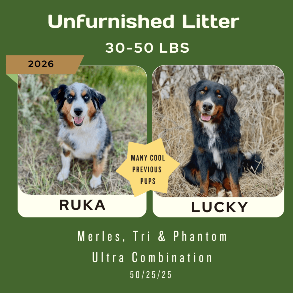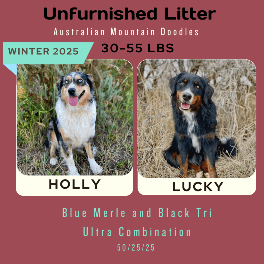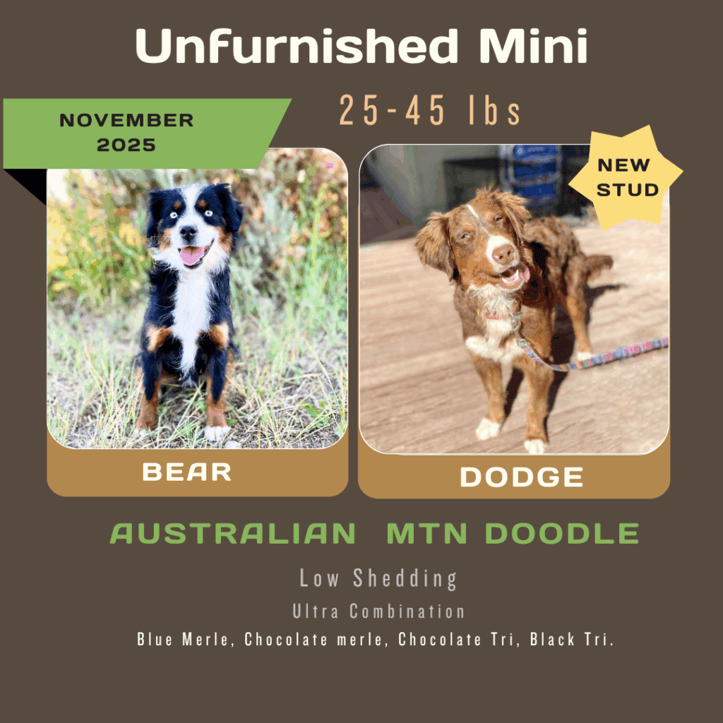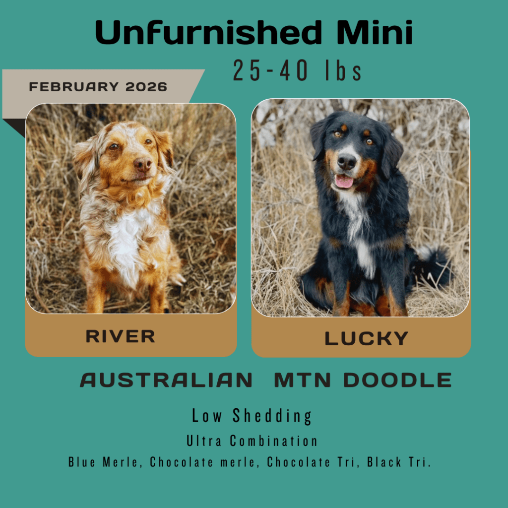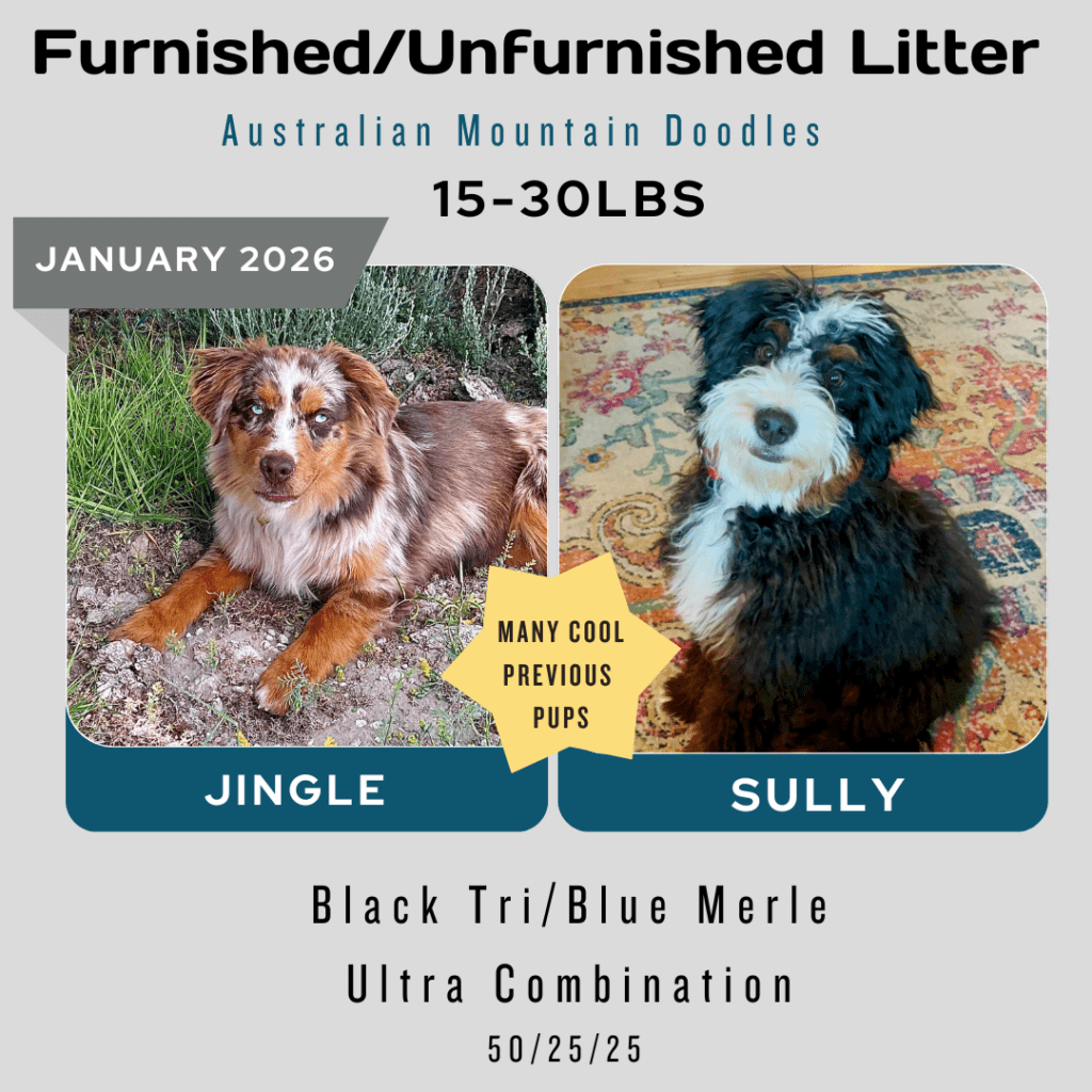 Available Pups & Past Litters Contact us next pups go home April 7-17th: Jellybean x Lucky... BORN Feb 5th 4 total ..... DUE MARCH 4, 2026 all colors and all unfurnished ..... DUE April 2026 all unfurnished and ALL colors ..... DUE April 2026 Chocolates all unfurnished ..... BORN JAN 3, 2026 Dolphin female blue merle sold: Ellie, colorado Jaguar femaleblack tri sold: Kara, Utah Bengal femaleblue merle sold: Laura, Michigan Raven femaleblack tri sold: Caitlyn and Kade, Colorado Seahawk male blue merle sold: Phil, Vancouver Bear femaleblue merle sold: Justina, New Jersey Panther MALEblack tri sold: chris, Massachusetts buffalo Bill MALEblue merle sold: Jeff, New Jersey 49er male black tri Blake, oklahoma2nd puppy chief MALE blue merle sold: Jana and Micheal, New York Bronco MALEblue merle sold: Dabney and Ryan, virginia cowboy MALEblue merle Harrison, florida "SKI BRANDS" THEME BORN JAN 2, 2026 7 TOTAL, 3 GIRLS, 4 BOYS-PICS COMING SOON Hart FEMALE MERLEfurnished blue merle idaho breeder Scarpa FEMALEfurnishedblue merle phantom Bodhi-utah Armada femaleunfurnishedblack phantom Bryan-new jersey Atomic maleunfurnished black tri Lewis-wyoming Blizzard/knox MALE furnishedblue merle Kelsey-Wyoming Salomon MALEunfurnishedblack phantom pending sold "Toys" Theme: Born November 21, 2026 5 puppies: 2 boys 3 girls pictures coming at 3 weeks old. Go to instagram to see videos of current litter. Nerf male chocolate tri sold: Deena, Washington Breyer female chocolate tri SOLD: Katherine, Colorado Lego male chocolate tri SOLD: Minyoung, CALIFORNIA schleich female black tri SOLD: SIENA, UTAH barbie female chocolate tri sold: Thomas, Arizona "Fall Colors" Theme born august 26, 2025 born June 29, 2025 the BEAR litter born march 31, 2025 the MAKEUP litter born April 4, 2025 the cattle litter born march 8, 2025 past litters Born 01/10/2025 "Planets Litter"Born: June 10, 2024 "Frontier/Trapper Litter"Born: march 23, 2024 "NATIONAL PARKS LITTER"Born: Feb 14, 2024***Retirement litter*** "The Soda Litter"BORN December 19, 2023 BORN Aug. 11, 2023 "INDIAN TRIBES LITTER"BORN DEC. 17, 2023 BORN Aug. 11, 2023 "TEACHERS LITTER"BORN AUGUST 11, 2023 "Lakes of America"Born: AUG. 8, 2023 "Tree Litter"Born May 18th River x Joeyborn May 12, 2022 "Friends Litter" Lilly X WINSTON"mini"un-furnished & furnishedborn 11-14-22 "Instruments Litter" Holly x sonny"mini"furnished born 11-7-22 "Elf on the Shelf Litter" River x joey"micro mini"unfurnishedborn 9-20-22 Lilly x winston"Micro-mini" 20-30lbsBorn April 22, 2022"animals theme" Sugar x sonny28-40lbsBorn April 24, 2022"baking theme" Indi x Dewey: Spirit riding free litter Born January 4, 2022 Rosie x DeweyAustralian mtn doodlesborn 11-11-21"PLANTS WE LOVE LITTER"