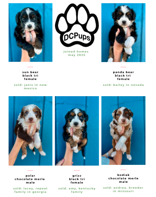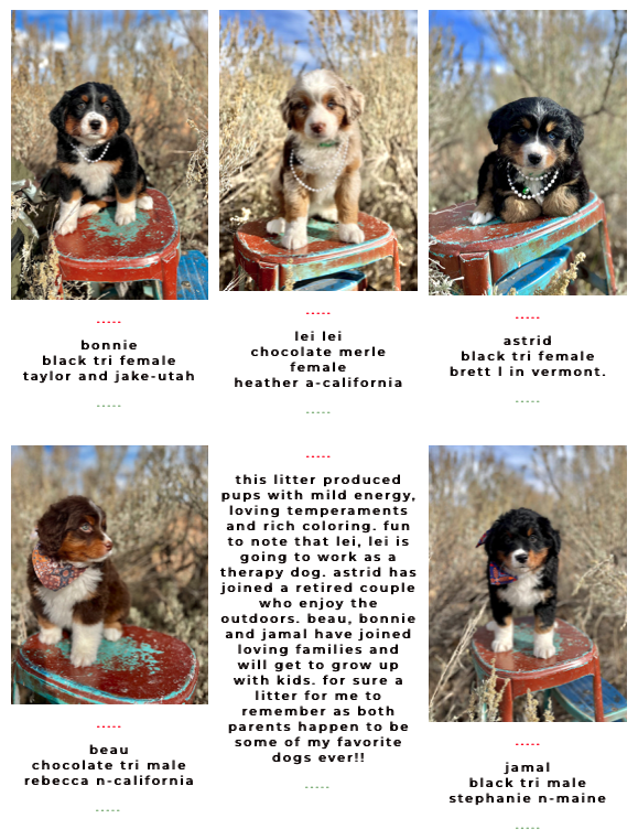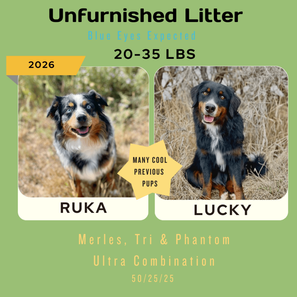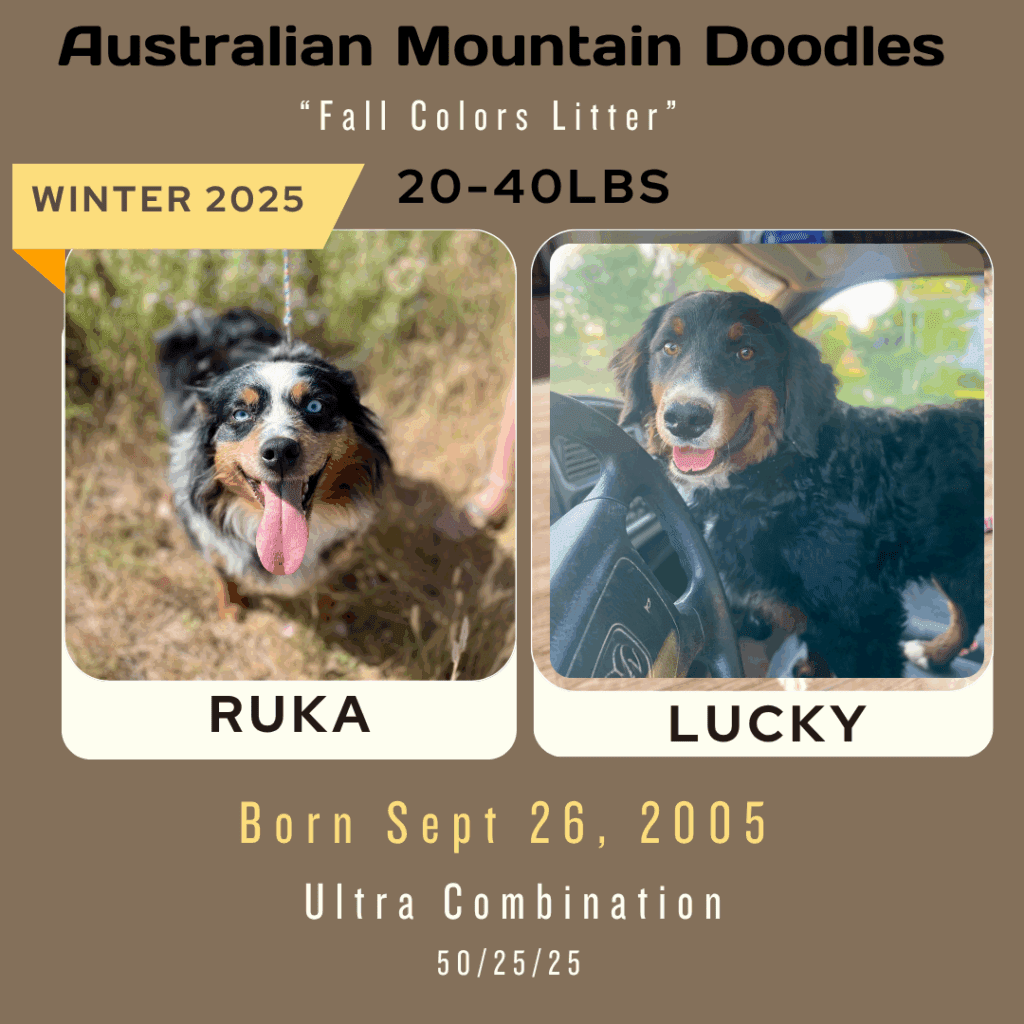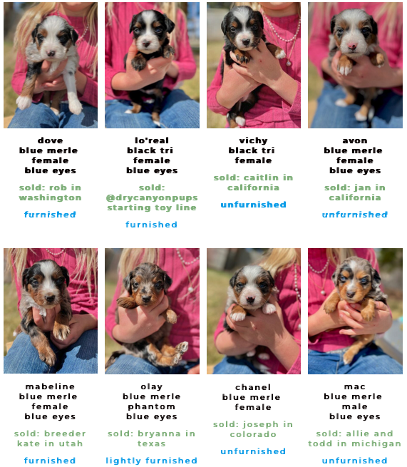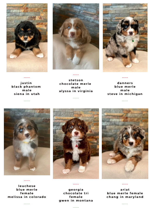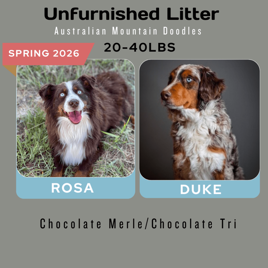 Available Pups & Past Litters Contact us next pups go home April 7-17th: Jellybean x Lucky... BORN Feb 5th 4 total ..... DUE MARCH 4, 2026 all colors and all unfurnished ..... DUE April 2026 all unfurnished and ALL colors ..... DUE April 2026 Chocolates all unfurnished ..... BORN JAN 3, 2026 Dolphin female blue merle sold: Ellie, colorado Jaguar femaleblack tri sold: Kara, Utah Bengal femaleblue merle sold: Laura, Michigan Raven femaleblack tri sold: Caitlyn and Kade, Colorado Seahawk male blue merle sold: Phil, Vancouver Bear femaleblue merle sold: Justina, New Jersey Panther MALEblack tri sold: chris, Massachusetts buffalo Bill MALEblue merle sold: Jeff, New Jersey 49er male black tri Blake, oklahoma2nd puppy chief MALE blue merle sold: Jana and Micheal, New York Bronco MALEblue merle sold: Dabney and Ryan, virginia cowboy MALEblue merle Harrison, florida "SKI BRANDS" THEME BORN JAN 2, 2026 7 TOTAL, 3 GIRLS, 4 BOYS-PICS COMING SOON Hart FEMALE MERLEfurnished blue merle idaho breeder Scarpa FEMALEfurnishedblue merle phantom Bodhi-utah Armada femaleunfurnishedblack phantom Bryan-new jersey Atomic maleunfurnished black tri Lewis-wyoming Blizzard/knox MALE furnishedblue merle Kelsey-Wyoming Salomon MALEunfurnishedblack phantom pending sold "Toys" Theme: Born November 21, 2026 5 puppies: 2 boys 3 girls pictures coming at 3 weeks old. Go to instagram to see videos of current litter. Nerf male chocolate tri sold: Deena, Washington Breyer female chocolate tri SOLD: Katherine, Colorado Lego male chocolate tri SOLD: Minyoung, CALIFORNIA schleich female black tri SOLD: SIENA, UTAH barbie female chocolate tri sold: Thomas, Arizona "Fall Colors" Theme born august 26, 2025 born June 29, 2025 the BEAR litter born march 31, 2025 the MAKEUP litter born April 4, 2025 the cattle litter born march 8, 2025 past litters Born 01/10/2025 "Planets Litter"Born: June 10, 2024 "Frontier/Trapper Litter"Born: march 23, 2024 "NATIONAL PARKS LITTER"Born: Feb 14, 2024***Retirement litter*** "The Soda Litter"BORN December 19, 2023 BORN Aug. 11, 2023 "INDIAN TRIBES LITTER"BORN DEC. 17, 2023 BORN Aug. 11, 2023 "TEACHERS LITTER"BORN AUGUST 11, 2023 "Lakes of America"Born: AUG. 8, 2023 "Tree Litter"Born May 18th River x Joeyborn May 12, 2022 "Friends Litter" Lilly X WINSTON"mini"un-furnished & furnishedborn 11-14-22 "Instruments Litter" Holly x sonny"mini"furnished born 11-7-22 "Elf on the Shelf Litter" River x joey"micro mini"unfurnishedborn 9-20-22 Lilly x winston"Micro-mini" 20-30lbsBorn April 22, 2022"animals theme" Sugar x sonny28-40lbsBorn April 24, 2022"baking theme" Indi x Dewey: Spirit riding free litter Born January 4, 2022 Rosie x DeweyAustralian mtn doodlesborn 11-11-21"PLANTS WE LOVE LITTER"